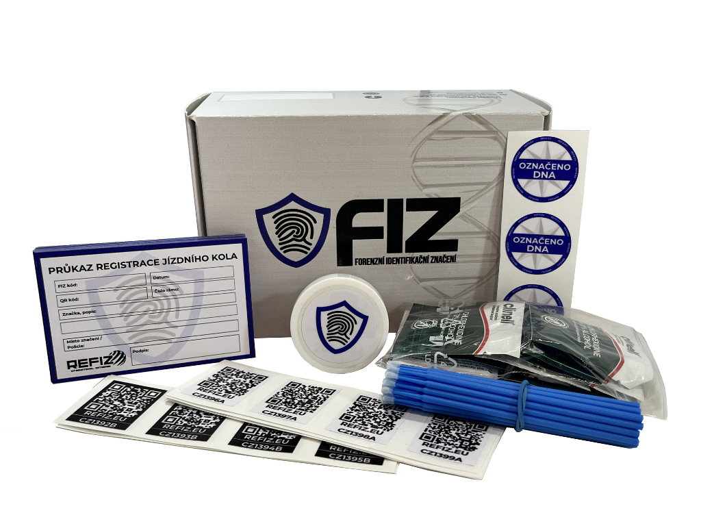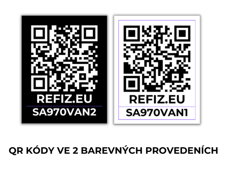 - Unikátní QR kód v podobě malé samolepky, který slouží pro 1 konkrétní označený předmět. Po naskenování lze v databázi REFIZ zjistit, zda je předmět zaregistrován či odcezen. Rozměr 2,5x3cm