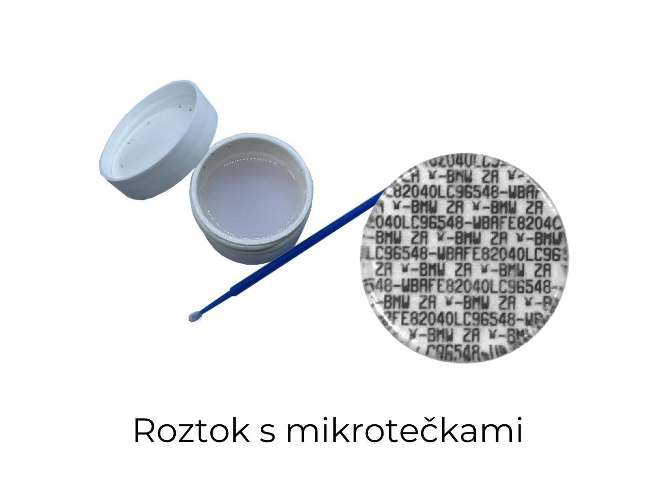 Označte si svůj majetek pomocí mikroteček s unikátním kódem. Mikrotečky jsou pouhým okem neviditelné a lze jimi označit vše, co má pro Vás hodnotu. Od mobilního telefonu, přes počítač, koloběžku, až po veškeré díly na Vašem autě. Mikrotečky se velmi špatně odstraňují a to právě kvůli jejich "velikosti" a kombinaci speciálního lepidla s UV nosičem.